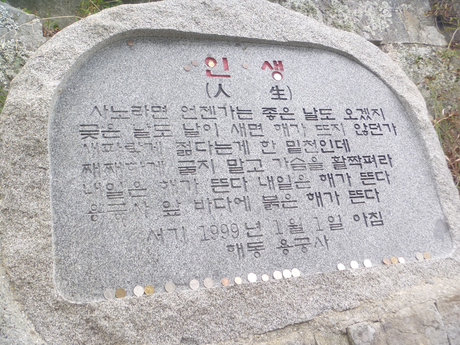 The main sanctuary of the temple was reconstructed in 1970 with careful attention paid to the colors that were traditionally used in such structures. On the right-hand side, inside the a cave, is a uniquely designed Buddhist sanctum, while situated just in front of the main sanctuary is a three-story pagoda with four lions. The four lions are symbolizing joy anger, sadness, and happiness. Other special sites at the temple are the 108 stairs and stone lanterns lining the rocky landscape. After going down the 108 steps, one will be delighted with the beauty of the temple. Midway down the 108 steps one can stop and enjoy the calming sounds of the waves as well view the majestic sunrise. Many people often come to this spot on New Year's Day to make a wish for the new year as they watch the sun come up. April is an especially beautiful time of year with cherry blossoms in full bloom. The birth of Buddha is also celebrated in April (following the lunar calendar) and offers a spectacular night view as the temple area is aglow with electrically lit lanterns.